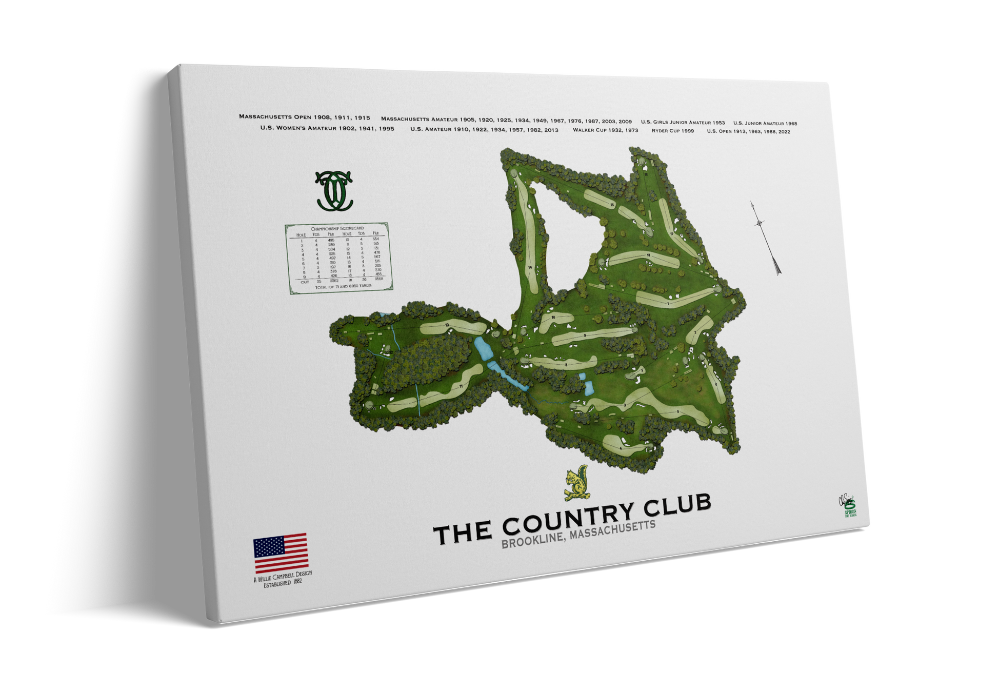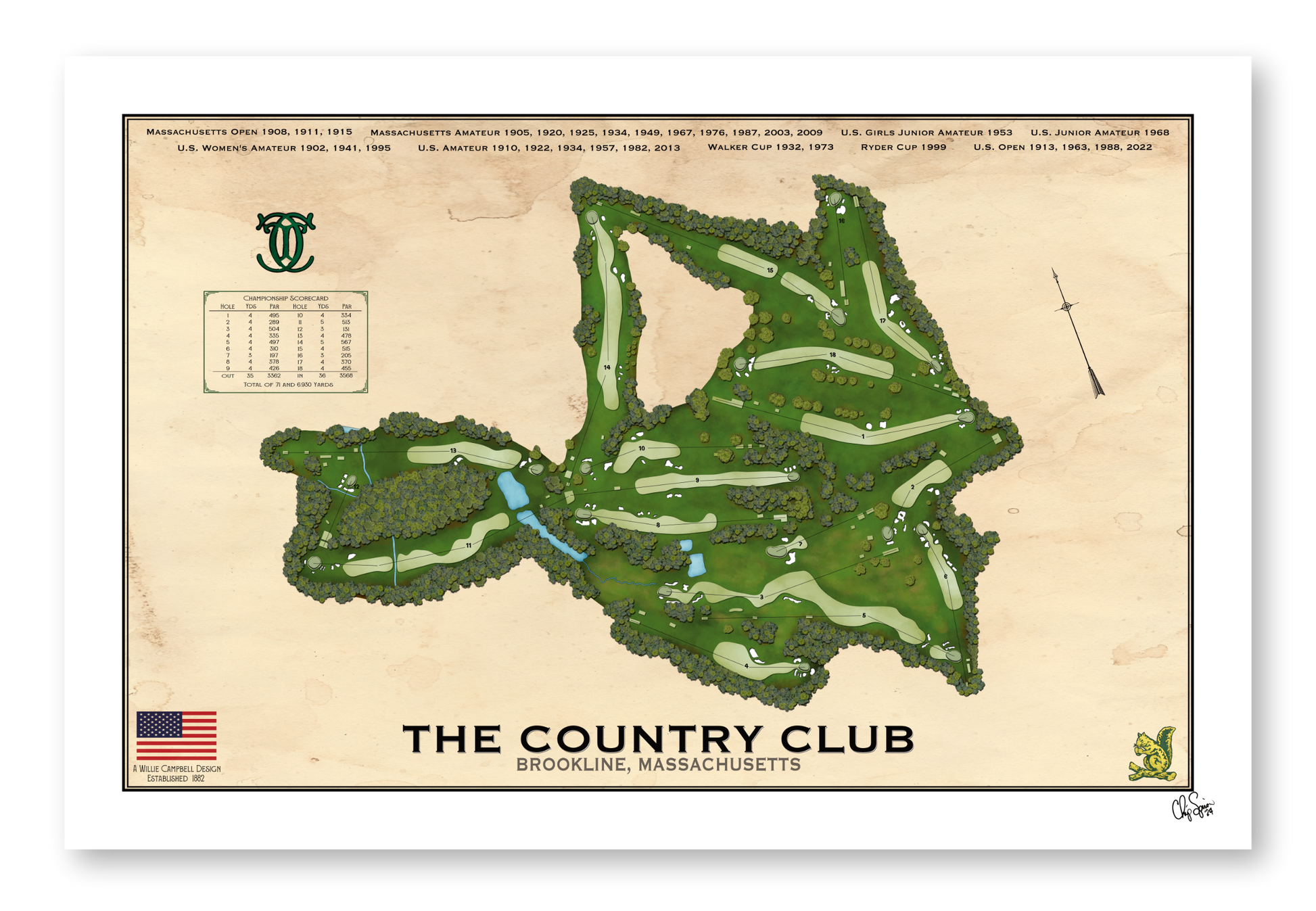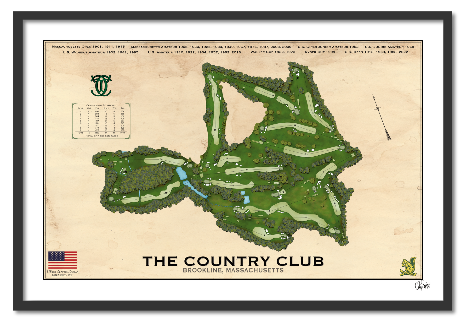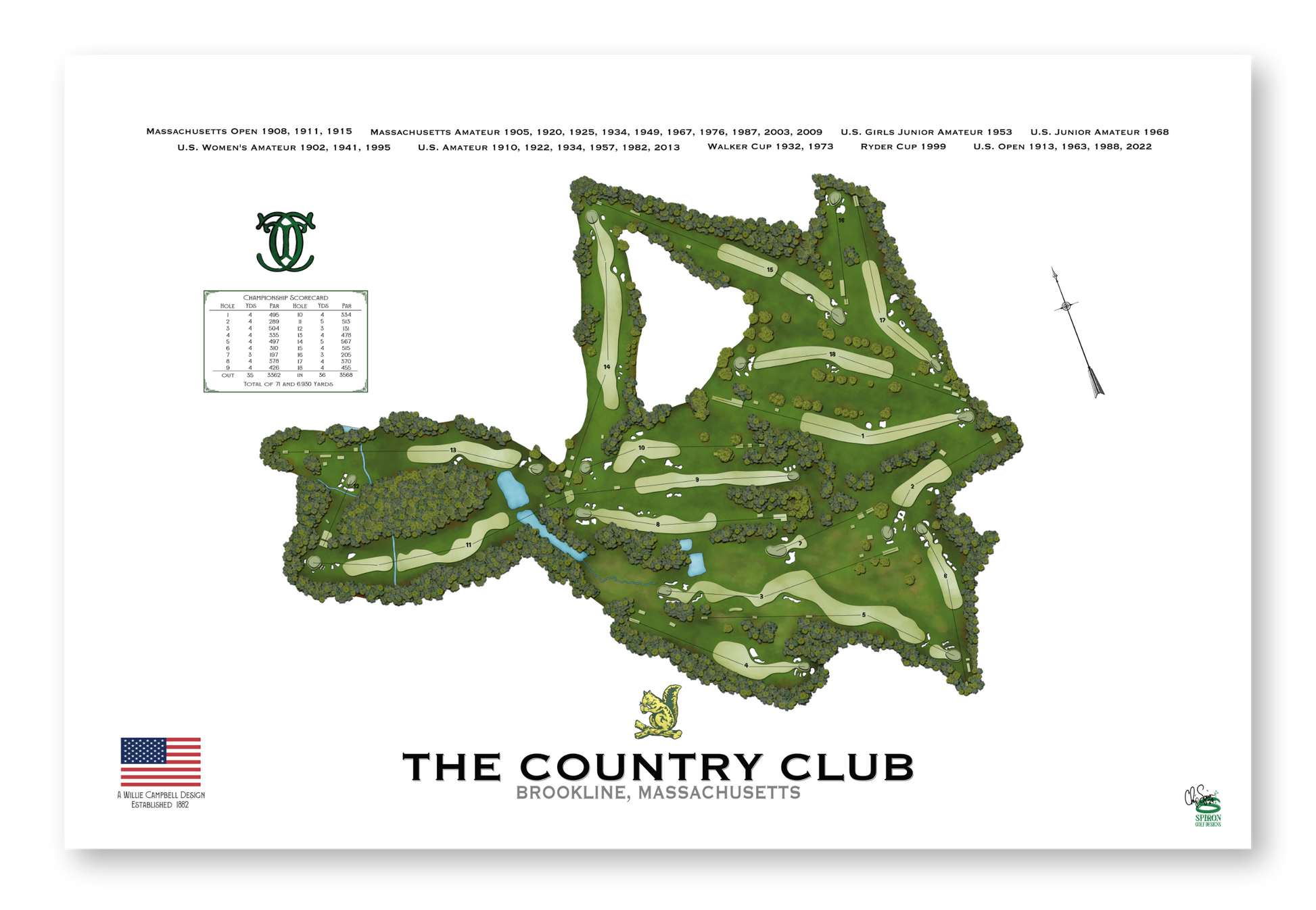 Honor one of the founding pillars of American golf with this finely crafted map print of The Country Club, located in Brookline, Massachusetts. As one of the five charter clubs of the USGA and host of multiple U.S. Opens, U.S. Amateurs, and the legendary 1999 Ryder Cup, The Country Club is steeped in tradition, drama, and history.